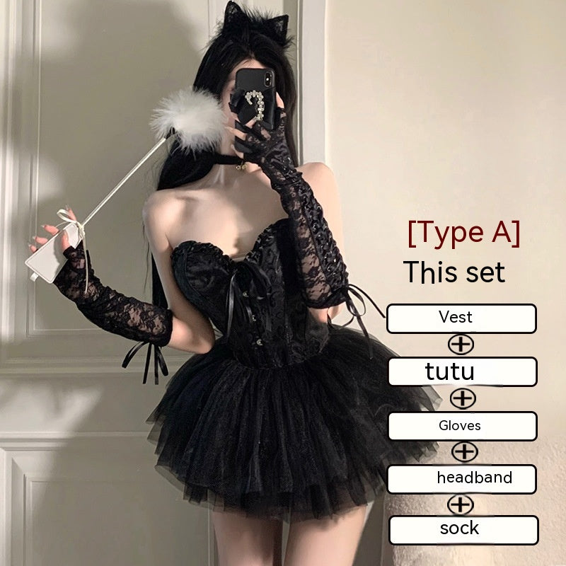 Color: A black split 2-piece set [vest + skirt], A black split 2-Piece Set + gloves, A black split 2-Piece Set + gloves + headband, A black split 2-Piece Set + gloves + headband + socks, A white split 2-piece set [vest + skirt], A white split 2-Piece Set + gloves, A white split 2-Piece Set + gloves + headband, A white split 2-Piece Set + gloves + headband + socks, B black split 3-piece set [Top + skirt + socks]], B black split 3-Piece Set + headband, B black split 3-Piece Set + headband + gloves, B black split 3-Piece Set + headband + gloves + collar, B white split 3-piece set [Top + skirt + socks], B White split 3-Piece Set + headband, B White split 3-Piece Set + headband + gloves, B white split 3-Piece Set + headband + gloves + collar